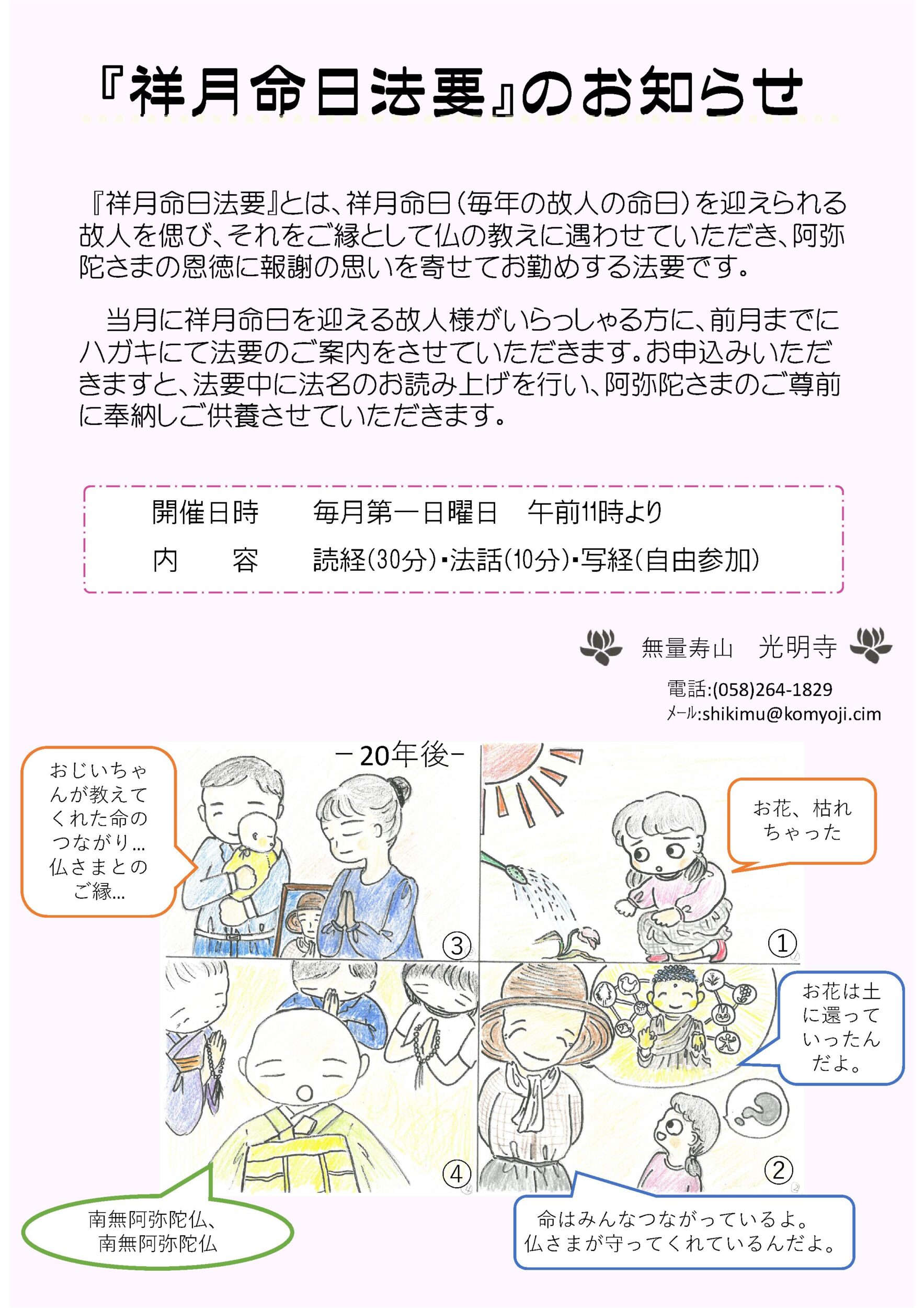 「祥月命日法要」は、その月に亡くなられた故人様を偲ぶとともに、仏さまとのご縁に遇わせていただく法要です。